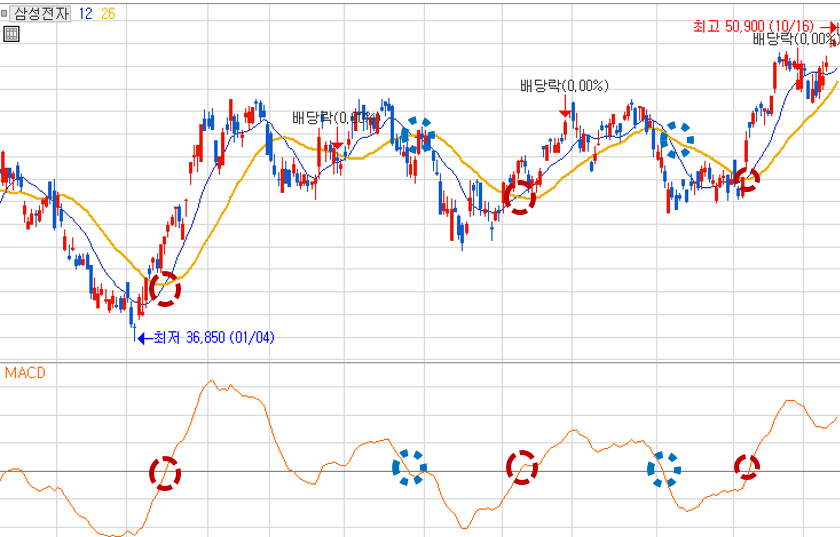 MACD오실레이터에서는 MACD와 시그널의 교차점이 0입니다.